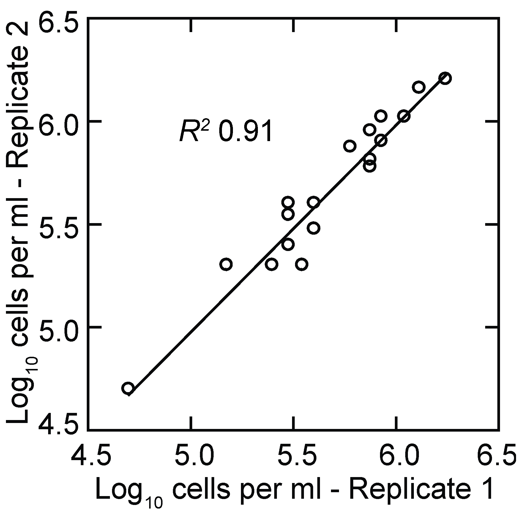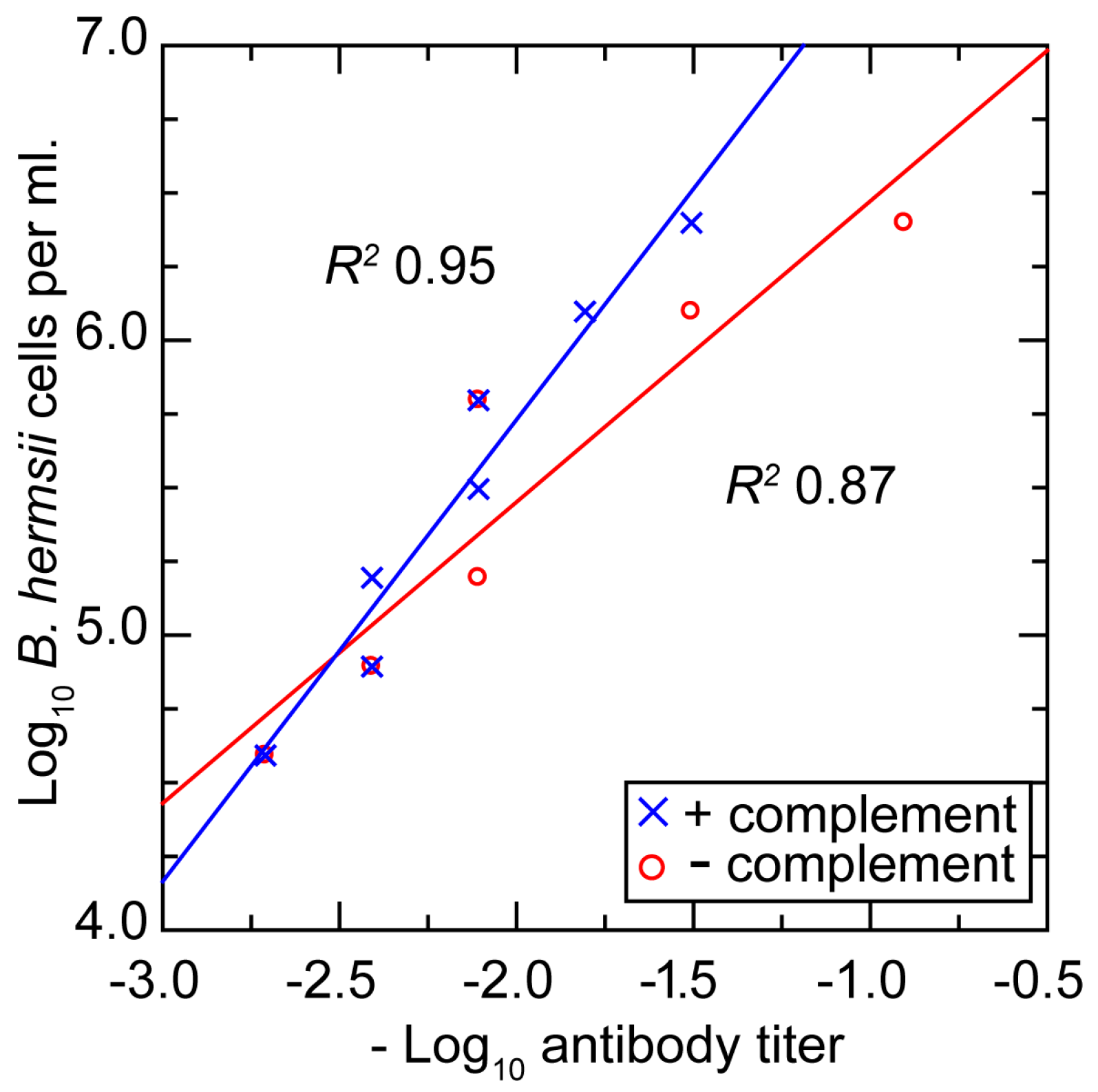 Scatter plot of replicate log-transformed counts of Borrelia hermsii cells in plasma samples from infected mice by phase microscopy and counting chamber. The linear regression and coefficient of determination (R2) are shown.