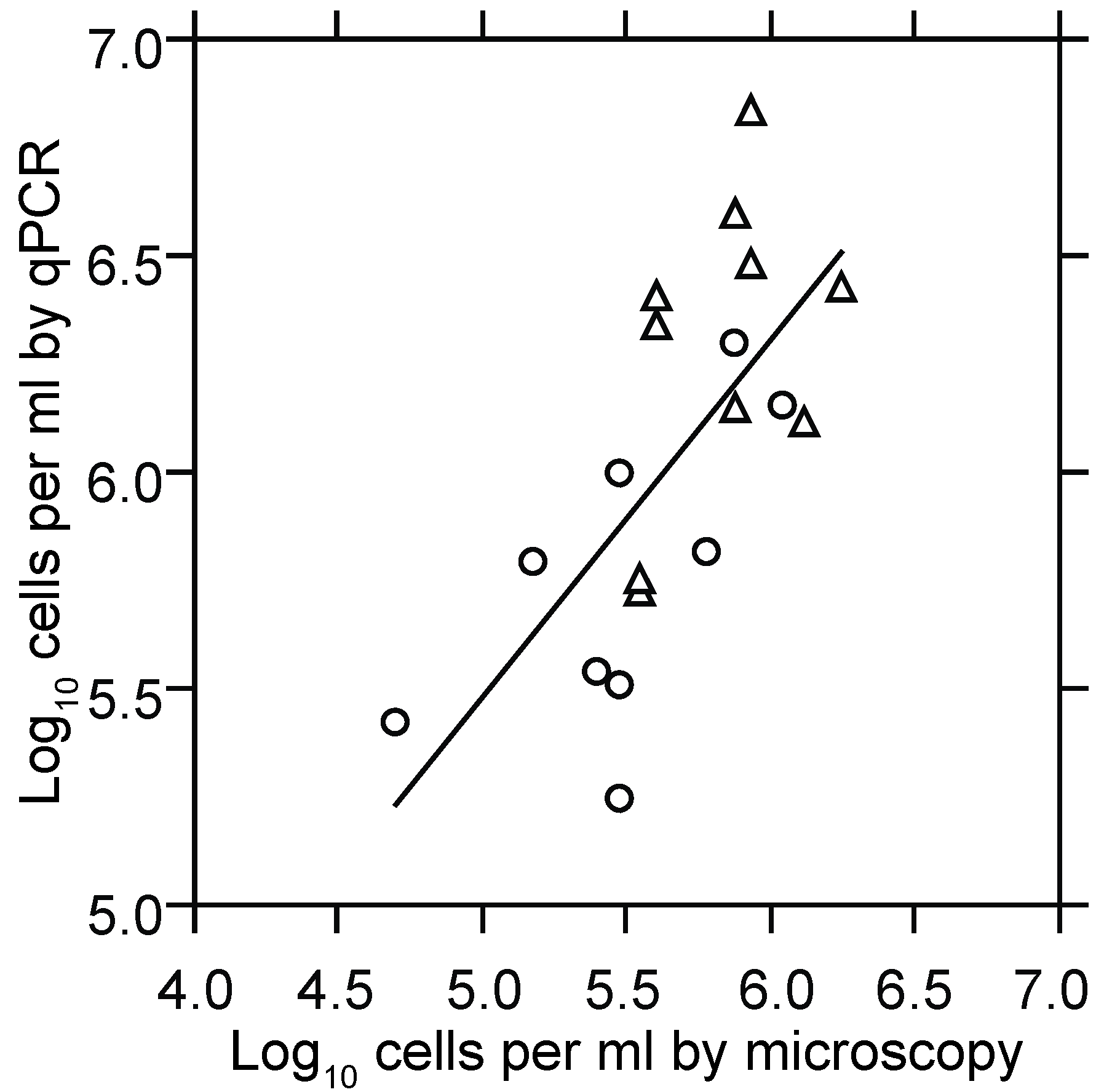 Scatter plot with linear regression of log-transformed counts of B. hermsii cells in plasma by phase microscopy and counting chamber (x-axis) and quantitative PCR (qPCR; y-axis). Circles and triangles denote samples of blood taken at hours 94.5 or 102 from immunocompetent BALB/c mice infected at hour 0, as described in the text. The slope (95% confidence interval) for the least-squares regression was 0.85 (0.4–1.3), and the combined R2 was 0.46 (p < 0.001).
