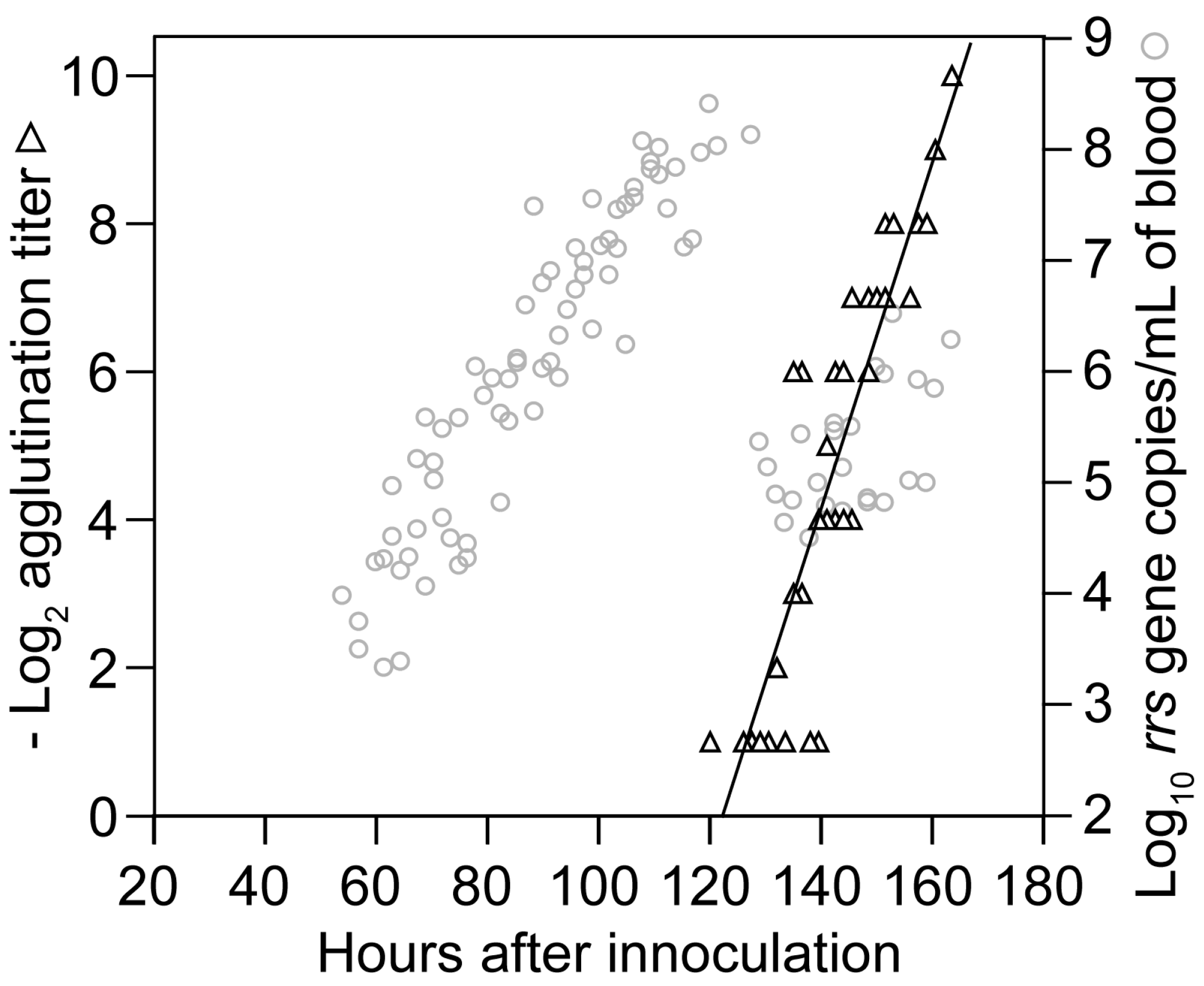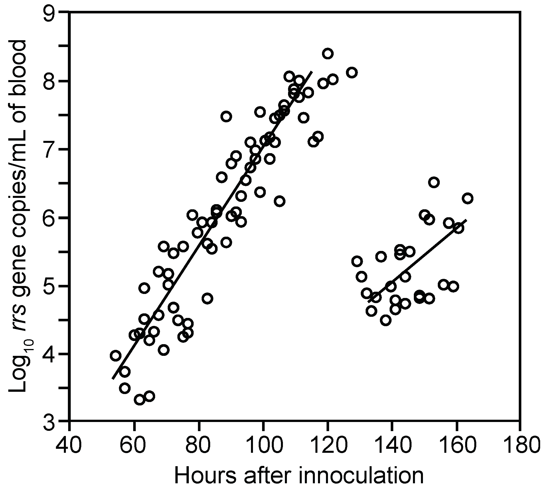 Proliferation and decline of B. hermsii HS1 cells in the blood of infected immunocompetent mice over time. The graph is a scatter plot of collected data on gene copies of 16S ribosomal RNA (rrs) of B. hermsii by qPCR (y-axis) against time in hours (x-axis) after inoculation of 95 BALB/c mice with serotype 7 of strain HS1. Samples were collected every 3 h beginning 12 h after inoculation; second samples were obtained from each mouse 7.5 h after the first. Each data point is a sampling from a single mouse. Linear regression determinations were made separately for hours 50–120 (R2 = 0.86) and >120.
