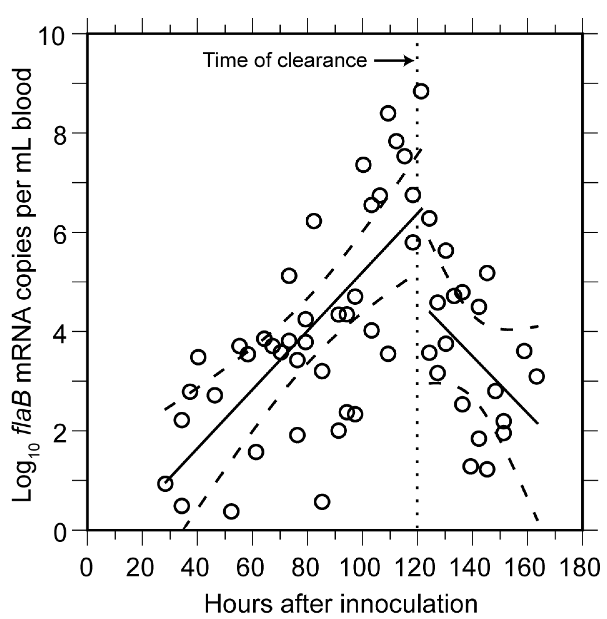 Rise and decline in mRNA for FlaB flagellin of B. hermsii in blood of infected mice. The experiment and sampling protocol were the same as described for Figure 3. The flaB transcripts were estimated by qPCR of cDNA produced with random hexamers. Each data point is a sampling from a single mouse. Linear regression determinations (with 95% confidence intervals denoted by dashed lines) were made separately for time points up to hour 120 and after hour 120. The time of clearance indicated is the approximate time point that genome counts began to decline (Figure 3).