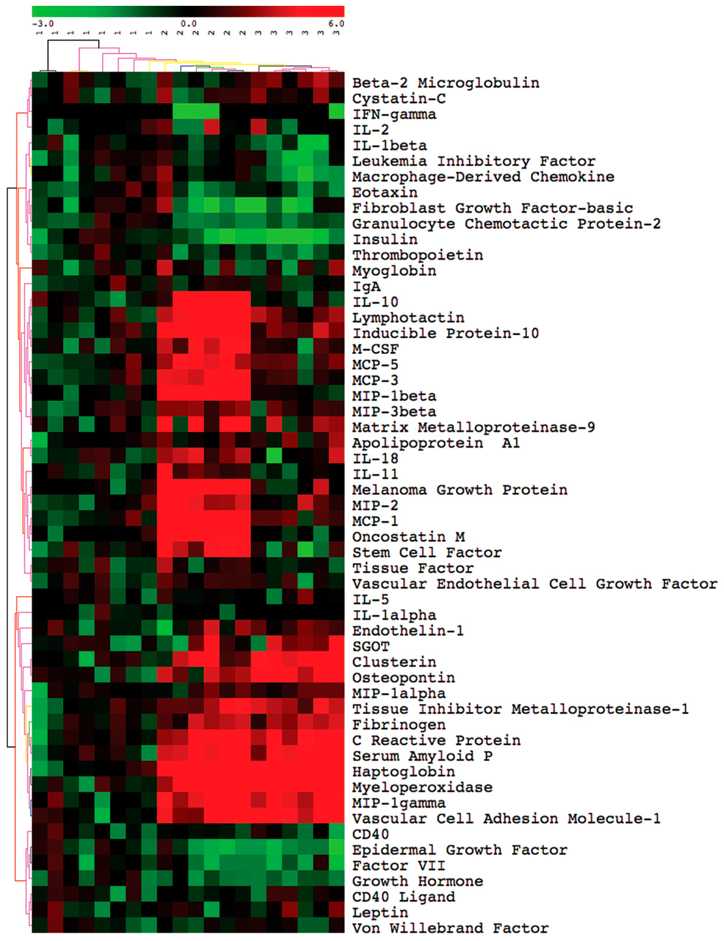 Figure 5 is a two-color graphical representation in heat map format of the results of the analysis with the 68 analytes and the three groups of samples: uninfected (designated as “1” in the figure), peak (“2”), and clearance (“3”). The data were normalized across the different analytes as Z scores, which were within a range of −3 to +6 and corresponded to numbers of standard deviations below or above the mean of the controls. The heat map is structured horizontally by experimental group and vertically by similarities in profiles. Three general patterns of analyte results across the three groups are apparent: similar analyte levels for all conditions, elevated values during the peak of infection and a decline with clearance, and elevated values over the controls during both the peak and clearance. The 28 analytes of Table S1 that did not significantly vary at the 0.05 level by either parametric or non-parametric tests between the three conditions were the following: apoliprotein A1, calbindin, CD40, CD40 ligand, cystatin, eotaxin, Factor VII, Fibroblast Growth Factor (FGF)-9, FGF-2, the chemokine Granulocyte Chemotactic Protein-2 (CXCL6), Granulocyte Macrophage-Colony Stimulating Factor, glutathione S-transferase, Interferon (IFN)-γ, Interleukin (IL)-1α, immunoglobulin A, IL-2, IL-3, IL-4, IL-12, IL-17, leptin, Leukemia Inhibitory Factor, myoglobin, lipocalin-2, RANTES, Tissue Factor, thrombopoietin, and von Willebrand Factor.