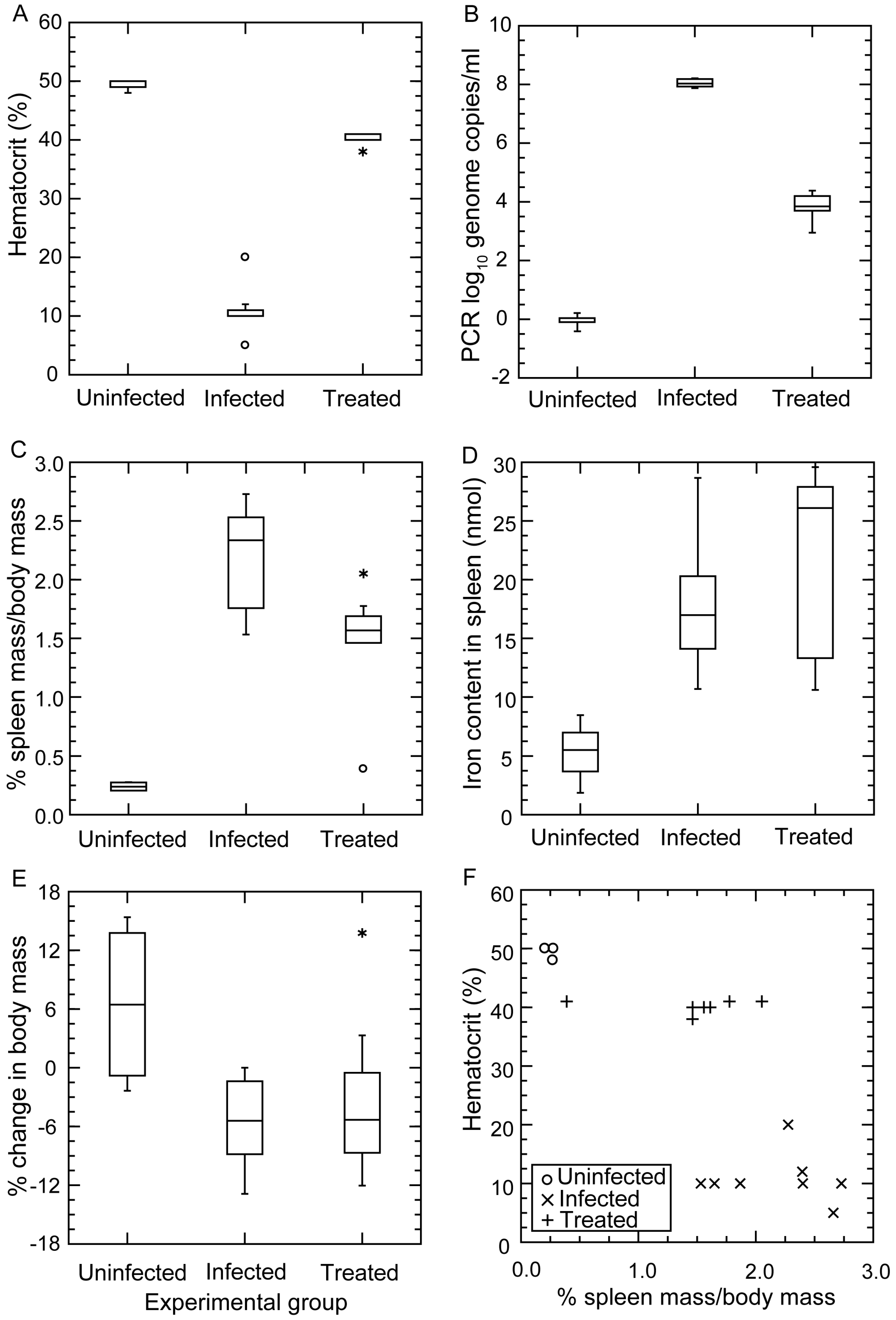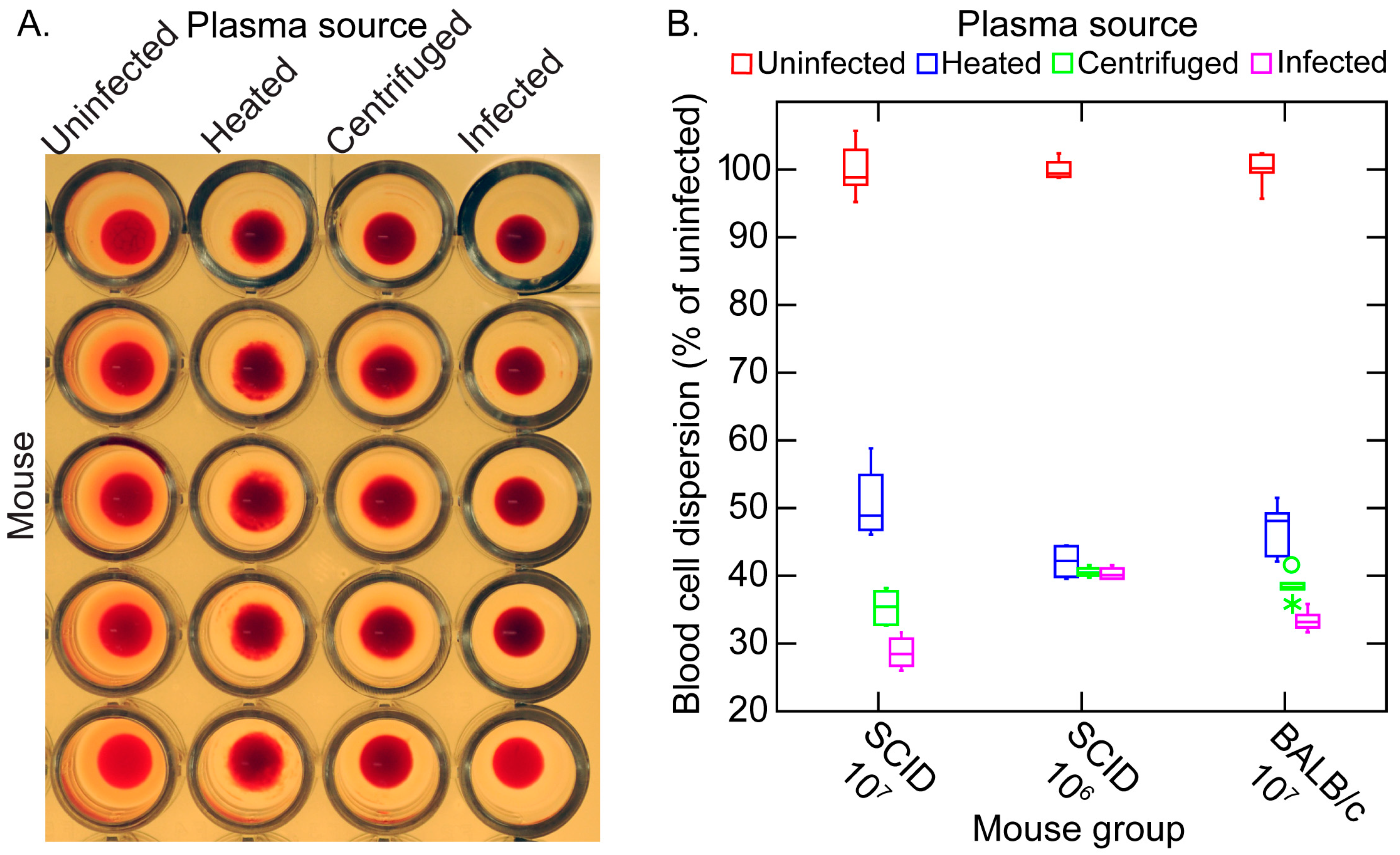 Mice were inoculated intraperitoneally with 1–10 B. hermsii cells in 100 μL of phosphate-buffered saline, pH 7.4 (PBS), with 5 mM MgCl2 (PBS-Mg) by intraperitoneal injection, unless otherwise noted. The innoculum cell count was determined either by limiting dilution for frozen stock of known viability or microscopic quantitation of cultures as described above. A rotation of one or two members of each group of inoculated mice was monitored daily for the presence and density of spirochetes by phase-contrast microscopy of a wet mount of blood obtained from the tail vein. Infected plasma was obtained from blood anti-coagulated with heparin or sodium citrate by centrifugation at 100× g for 3 min. Cell-free plasma was obtained by centrifugation of the infected plasma at 9500× g for 5 min for the aggregation experiment and at 16,000× g for 10 min for antibody experiments. At the time terminal anesthesia, the mice were weighed, and whole spleens were dissected and weighed. Spleens of some mice were fixed in 10% buffered formalin for histopathology processing at University of California Davis’ Comparative Pathology Laboratory (Davis, CA, USA). Mice that were treated with an antibiotic received ceftriaxone (Sigma-Aldrich) at a dose of 25 µg per gm of body weight and administered subcutaneously every 12 h for 3 d, as described [62]. The hematocrit, percentage of packed red blood cells, was determined with heparinized microhematocrit capillary tubes (Fisher Scientific) with Critoseal caps (Oxford Labware, St. Louis, MO, USA) and centrifugation for 5 min on a ZIPocrit microhematocrit centrifuge (LW Scientific, Lawrenceville, GA, USA).
