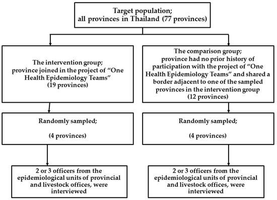 The pilot project for the establishment of “One Health Epidemiology Teams at the Provincial Level” included few provinces (19 provinces). We used a simple random sampling technique to select four provinces from this initial group entitled “the intervention group” without the calculation of sample sizes due to budget limitations. The comparison group consisted of four provinces that were randomly selected by using a 1 (Intervention group) to 1 (Comparison group) ratio. For the comparison group, the sampling frame came from a list of 12 provinces that shared a border adjacent to one of the sampled provinces in the intervention group. The inclusion criterion for the comparison group required that the province had no prior history of participation with the “One Health epidemiology teams at provincial level” project (Figure 1).