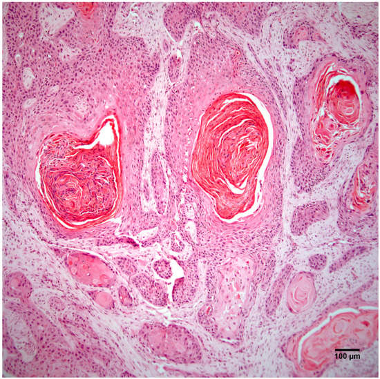 The right hindlimb mass is an unencapsulated dermal and subcutaneous neoplasm composed of nests, streams, and sheets of neoplastic cells that multifocally surround central accumulations of keratin. Hematoxylin and eosin staining. Scale bar 100 µm.