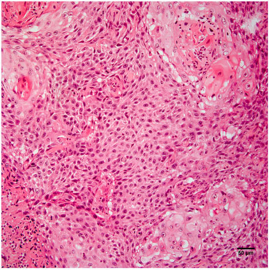 The right hindlimb mass is an unencapsulated dermal and subcutaneous neoplasm composed of nests, streams, and sheets of neoplastic cells that multifocally surround central accumulations of keratin. Hematoxylin and eosin staining. Scale bar 100 µm.