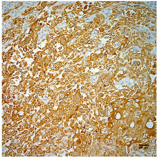 Neoplastic cells from the right hindlimb mass exhibit strong positive cytoplasmic immunostaining for pancytokeratin. Hematoxylin counterstain. Scale bar 50 µm.