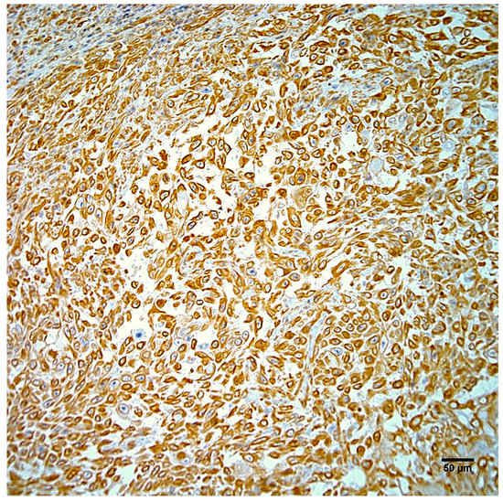 Neoplastic cells from the right hindlimb mass exhibit strong positive cytoplasmic immunostaining for vimentin. Hematoxylin counterstain. Scale bar 50 µm.