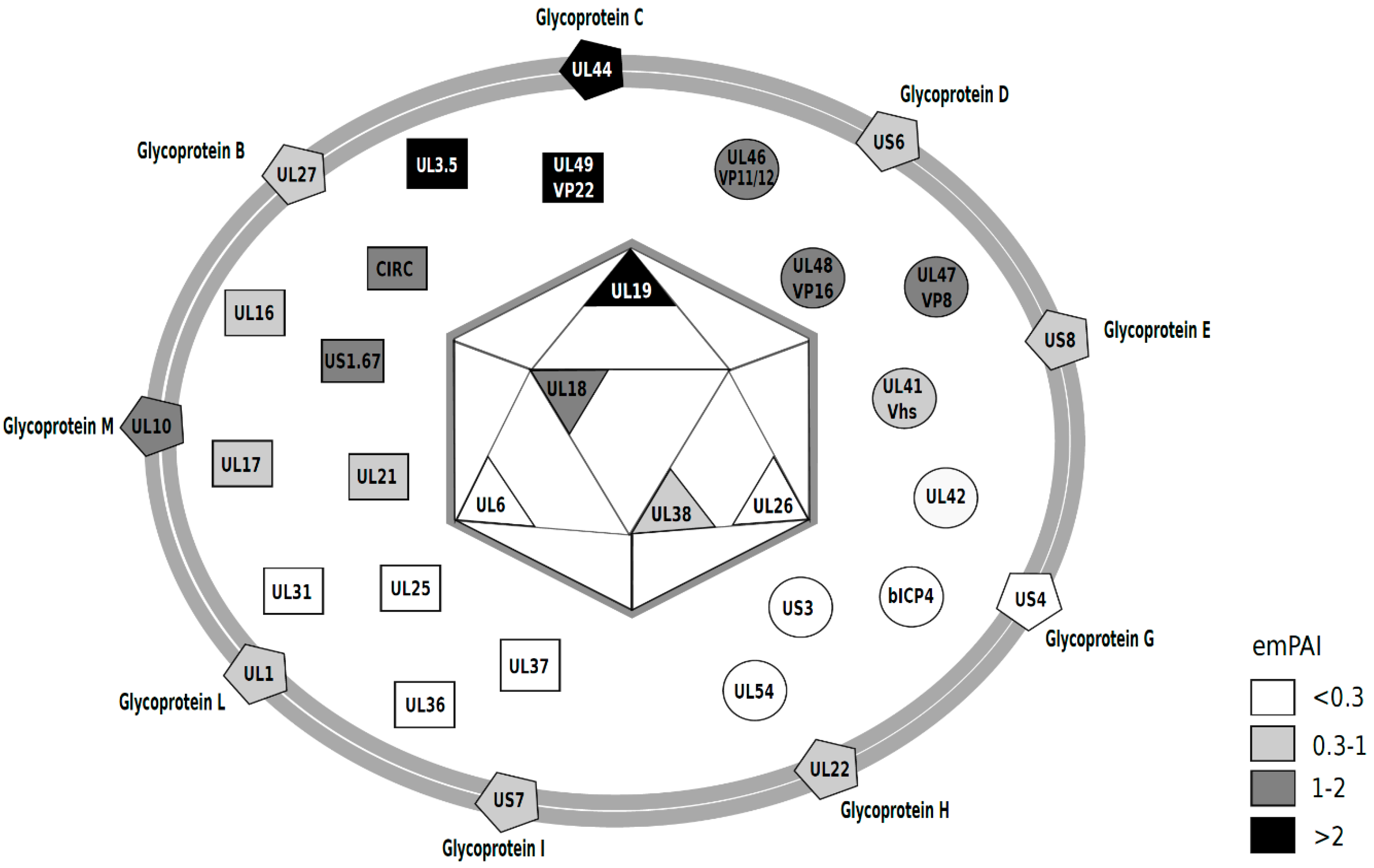 Diagram of the BoHV-1.1 viral particle, representing the viral proteins detected in this study. The relative abundance was estimated based on emPAI scores [39] (Table 1) and are presented on a gray-scale that correlates with abundance (darker = more abundant). emPAI values < 0.3 (white); 0.3–1 (light gray); 1–2 (dark gray) and >2 (black). The diagram was inspired by those of past work [30,31,40].