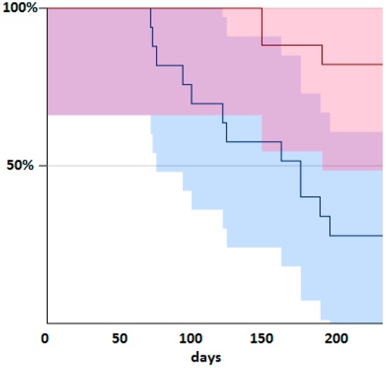Kaplan Meier plot of time cataract-free on alpha lipoic acid (red) or placebo (blue).