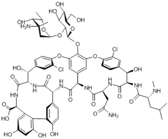 Vancomycin is a large glycopeptide compound with a molecular weight of 1448 Da which inhibits a late stage in bacterial cell wall peptidoglycan synthesis [8,9]. Amino acids present in vancomycin are synthesized, joined together, and cross-linked to assemble vancomycin [10]. The chemical structure of vancomycin is displayed in Figure 1. The three-dimensional structure of vancomycin contains a cleft that fits by hydrogen bonding with the peptides of a highly specific configuration of l-alanyl-d-alanyl-d-alanyl which is found only in bacterial cell walls; therefore, vancomycin is selectively toxic by forming stable complexes [11].