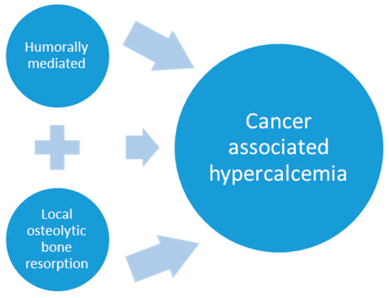 Cancer-associated hypercalcemia is mediated by two principal mechanisms that include: humoral hypercalcemia of malignancy (HHM) due to circulating tumor-produced factors and hypercalcemia resulting from primary bone tumors or metastases with local osteolytic bone resorption (LOH) (concepts are illustrated in Figure 1 below). Additional mechanisms have been described, although they are rare. These include ectopic parathyroid hormone (PTH) production or primary hyperparathyroidism that coexists with malignancy [4,8,46,47]. This review will focus on HHM; however, it is worth mentioning that metastatic bone tumors release factors that can function to induce both local osteolytic bone resorption and systemic HHM.