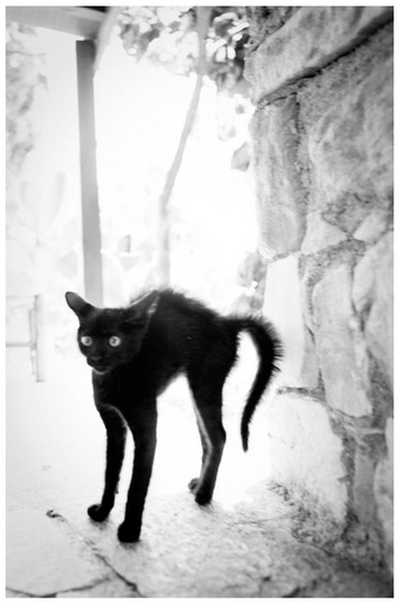 The “Halloween” cat. “Tippy-toes”, straight tail, arched back. Source: https://s-media-cache-ak0.pinimg.com/236x/77/e7/2b/77e72bd52e264155a346c00c986b6fa8.jpg.