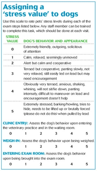 Clinic dog stress scale, from zero to five, on entry to the clinic, weigh-in and entering the exam room. Source: Overall, 2013 [5]. (Reprinted with Permission from dvm360, Oct. 2013, Facing fear HEAD ON by Karen Overal, M.A., VMD, PhD, DACVB, CAAB. dvm360 is published by Advanstar Communications, Inc. dba UBM.)