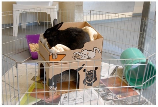 Kennels and treatment areas (discussed below) are potentially areas that cause high stress. Cats should be housed separately from dogs, and both should be kept in kennels that face walls rather than other animals to decrease visual contact. The natural instinct of a cat when exposed to a threatening situation is to retreat, however if this is not possible then it will attempt to conceal itself from view (Kry and Casey, 2007 [51]). Providing cats with hiding places, such as a cardboard box (that they can also use as an elevated platform should they choose) allows cats to perform this coping behaviour, possibly affording a sense of control/autonomy over the environment, and alleviates stress (Kry and Casey, 2007 [51]). The simple act of partially draping a towel over the cage door makes cats less exposed, thus reducing stress. Indeed, some cats will not eat or use their litter tray in full view of veterinary staff. In Canada, the British Columbia SPCA has developed the Hide, Perch & Go™ box to help reduce stress in shelter cats. The box is made of plasticised cardboard and enables the cat to exhibit natural behaviours of perching on top in a shallow tray or hiding inside. The box also serves as a cat carrier; hence the owner can take a newly adopted cat home in a familiar and scent-stable environment. The box has been adapted for use in veterinary hospitals and isolation areas where cats may spend a large amount of time in a potentially stressful environment (Lloyd, 2008 [47]). While there is no supporting scientific evidence, the box also appears to be beneficial for rabbits by providing hiding, perching and scent-marking opportunities (Figure 5). Dogs and cats, and other animals, could be given the option to spend quality time working for their food, for example, by eating from a stuffed KONG toy to alleviate boredom. This type of toy can be filled in advance with wet food (or, where appropriate, a small amount of peanut butter or processed cheese sauce as a treat) and frozen for later use; frozen contents take longer to eat, thus enhancing the environmental enrichment.