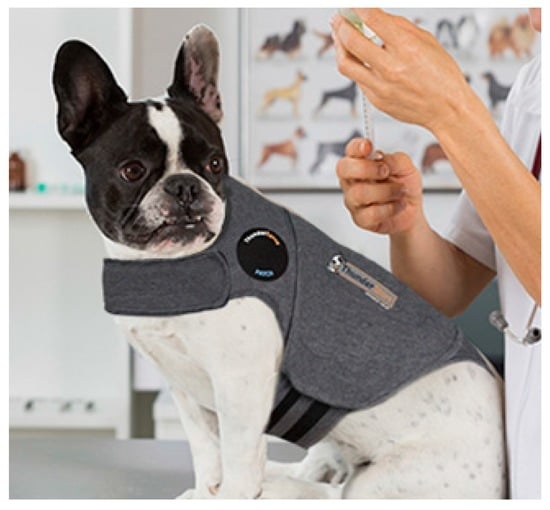 The ThunderShirt. A compression garment used to help dogs (and cats) feel more secure, based on the concept of swaddling. Source: http://www.thundershirt.com/media/review/TWVet-SS.jpg.