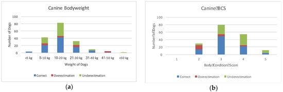 20], which is in line with our current findings. Owners need to be educated about modifying feeding rations if their pet’s BCS is not within an ideal range. Based on these findings, investigating whether owners are aware of this is justified as part of a future study. Furthermore, less than half of owners were able to correctly estimate BW within 10% accuracy. Although there was a significant association between owner estimation of BW and interpretation of the wet pet food label, this was not the case for the dry label, and this is a concern given that most owners in the UK feed dry food to their dogs [