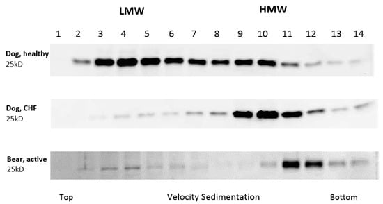 Identification of myocardial adiponectin fractions from velocity sucrose gradient sedimentation in a healthy dog, dog with congestive heart failure (CHF), and an active bear. Fractions 3–6 contain the low-molecular weight form (LMW) and 9–12 contain the high-molecular weight form (HMW).
