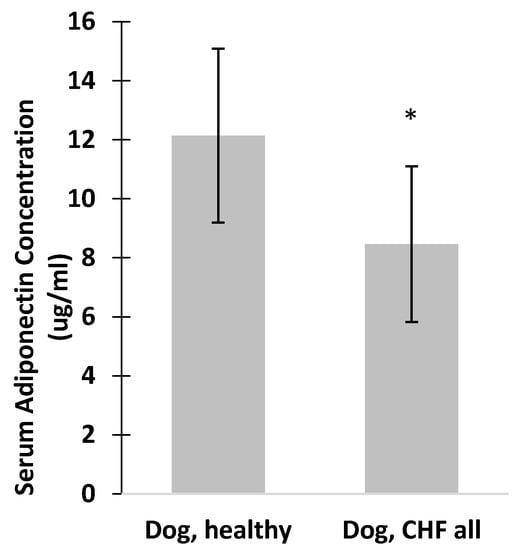 Healthy dogs (n = 18) and dogs with CHF (n = 18) were used to assess serum adiponectin. Dogs were included for sampling in the healthy group if the dog had no reported signs of systemic or cardiopulmonary illness and had a normal cardiovascular examination. The breeds of dogs included were: Beagle, Chihuahua (2), Maltese, Miniature Australian shepherd (2), Miniature Dachshund (2), Norfolk terrier, Pug, and eight mix-breeds. These dogs ranged in age from 4–12 years (mean weight: 8.7 kg). Dogs in the CHF group presented with clinical signs consistent with pulmonary edema and were ultimately diagnosed with decompensated MMVD by radiography and echocardiography. Dogs included for sampling in this study were classified into stage C or D (nine in each stage) according to the guidelines for the diagnosis and treatment of MMVD []. The breeds of CHF dogs included were: American Cocker Spaniel (2), Beagle, Brittany, Brussels Griffon (2), French Bulldog, Maltese (2), Miniature Schnauzer (2), Pembroke Welsh Corgi, Silky Terrier, Toy Poodle, and four mix-breeds. These dogs ranged in age from 9–14 years (mean weight: 9.4 kg). Blood samples were collected, spun, and stored at −80 °C.