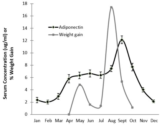 The serum concentration of adiponectin in bears varied seasonally, and was significantly lower during hibernation (November–February, 2.6 ± 0.8 μg/mL) than during the summer active period (April–August, 6.5 ± 0.5 μg/mL) (Figure 3). Its concentration increased dramatically in September (12.1 ± 1.5 μg/mL) after rapid weight gain occurred in August (fall hyperphagia). Adiponectin declined rapidly in October and November.