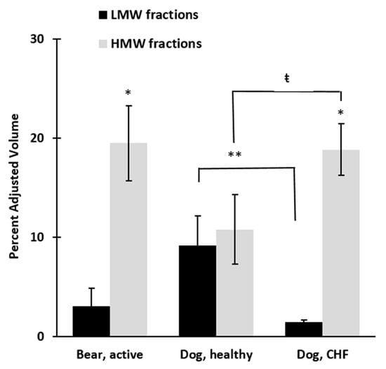Pooled LMW and HMW fractions of myocardial adiponectin protein in six active bears, six healthy dogs, and six dogs with congestive heart failure (CHF). Fractions 3–6 contain the LMW isoforms of adiponectin and fractions 9–12 contain the HMW isoforms. Bears expressed 6.3 times greater concentration of HMW isoforms relative to LMW isoforms in both active period and hibernation. Healthy dogs expressed similar amounts of adiponectin isoforms, but dogs with CHF expressed 12 times greater concentrations of the HMW isoforms. * p < 0.0001; ** p = 0.005; ŧ p < 0.001.