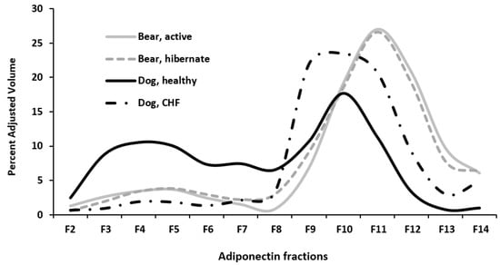In addition, adiponectin expression in humans with cardiac disease may be confounded by high body mass index or type II diabetes, as there are more clear effects on adiponectin in humans with these conditions than in dogs [,,,]. High molecular weight adiponectin is also predominately expressed in the bear. Brown bears may need to maintain HMW adiponectin, as they have dramatically reduced cardiac output during hibernation, have evolved to accumulate large fat deposits in the fall, and subsequently switch from a lipogenic to lipolytic state as they enter hibernation []. In both the bear and dog, myocardial adiponectin is expressed independent of circulating adiponectin levels suggesting a local regulatory mechanism within the heart.
