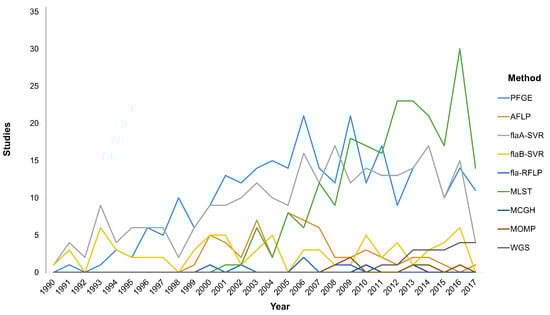 Graphical analysis of the applied molecular typing methodologies over time based on PubMed search. The use of molecular methodologies for the differentiation of Campylobacter at species and strain level has been modified during the last decades according to the new trends in technology, the improvements in bioinformatics, and the needs of the scientific community. Pulsed-field gel electrophoresis (PFGE), amplified fragment length polymorphism (AFLP), fla short variable region (fla-SVR), fla restriction fragment length polymorphism (fla-RFLP), multi-locus sequence typing (MLST), microarray comparative genomic hybridization (MCGH), major outer membrane protein (MOMP), whole genome sequencing (WGS).