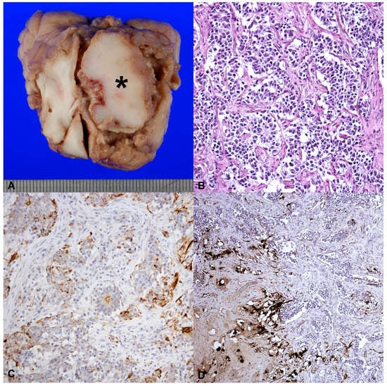 (A) Macroscopic aspect of tumor that was found in the right frontal sinus of a 5-year-old male Swiss shepherd dog, along with a wide, irregular, brown-white and firm lesion, measuring 3.5 × 3 × 3 cm, occupying the right frontal lobe and compressing the contiguous cerebral parenchyma; (B) Round-to-oval cells organized in sheets or pseudorosettes supported by hypocellular zones of delicate fibrillary stroma; 40×; (C) Neoplastic cells densely organized. The picture shows the positivity for citokeratines, 20×; (D) The picture shows tumor cells isolated or small cluster, that were immunopositive for NF; 20×.