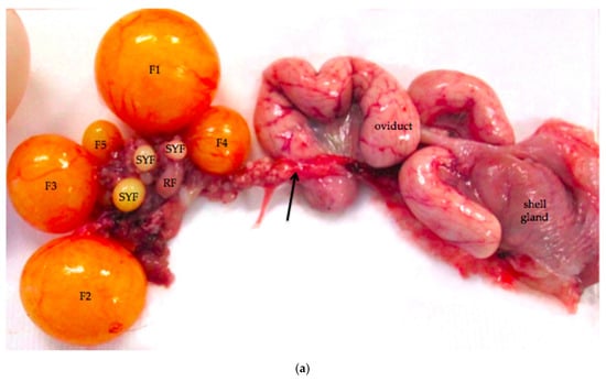 During active reproductive periods, laying hens maintain five or six pre-ovulatory follicles with diameters increasing from 9 to 40 mm (Figure 1). Once follicles enter the pre-ovulatory hierarchy, they begin to express anti-apoptotic proteins []. After ovulation of the largest pre-ovulatory follicle (F1 follicle), the other pre-ovulatory follicles increase in size, with F2 becoming F1, F3 becoming F2, and so forth, while a single follicle is recruited from the small yellow pool to move into the follicular hierarchy. Johnson and Woods [] and Johnson [] discuss endocrine controls on follicle selection, a topic that is beyond the scope of the present paper.