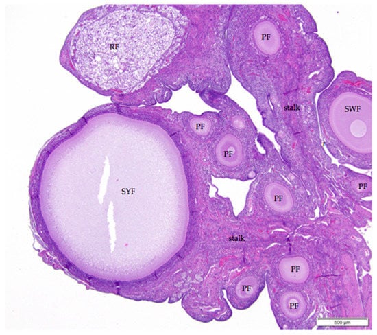The laying hen ovary has a complex three-dimensional topography. The more eosinophilic medulla of the mature laying hen ovary can usually be distinguished from the more basophilic cortex containing the follicles. Larger follicles, such as the small yellow follicle (SYF) in this image, extend from the surface on stalks (labeled) with cores of connective, nervous, and vascular tissue. Follicles in all states of development can be observed in ovaries of reproductively active birds. This image also includes small white (SWF), primary (PF), primordial (unlabeled), and regressing (RF) follicles. H & E. 40×.