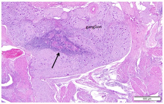 Large vessels and nerves enter the ovary at the ovarian hilus (Figure 1). The left cranial renal artery is usually the main blood supply to the ovary. Two large ovarian veins drain into the caudal vena cava. Infiltrates of leukocytes are located in the perineurium of ovarian and adrenal ganglia (Figure 4).