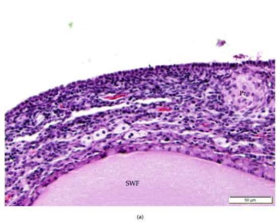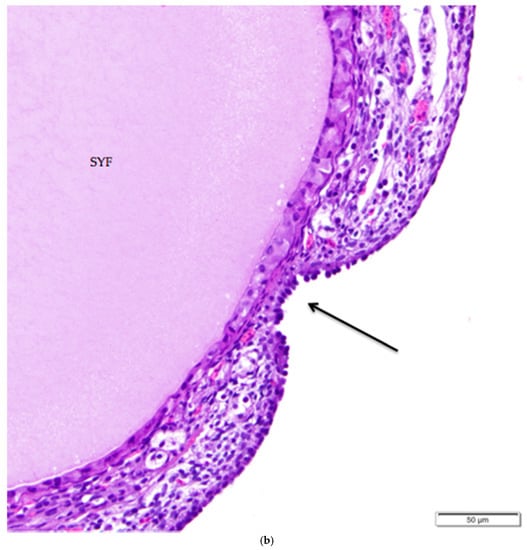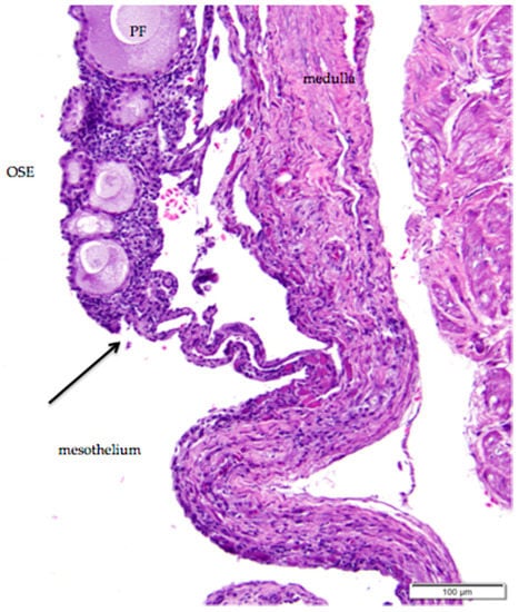 As we observed, simple squamous coelomic mesothelium smoothly transitions to the more typically cuboidal ovarian surface epithelium near the ovarian hilus, an observation consistent with other studies []. We observed variations in morphology of ovarian surface epithelium that may be related to the state of development of the underlying follicle. A similar change in morphology of the ovarian surface epithelium has also been observed in Japanese quail []. These changes are likely related to the steroidogenic and endocrine activity of the adjacent follicles and the stromal cells in the ovarian cortex that are in contact with ovarian surface epithelium [].