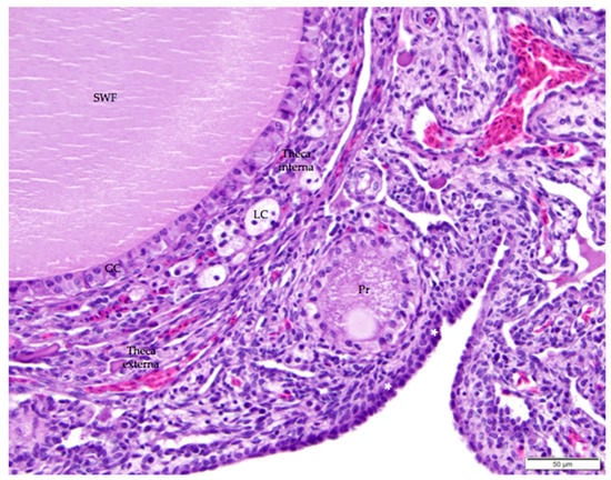 The thin, collagenous tunica albuginea that separates the surface epithelium from the ovarian cortex is occasionally visible (white asterisks). The image includes a small white follicle (SWF) and a primordial follicle (Pr). A single layer of granulosa cells (GC) delineates each follicle. The small white follicle is also surrounded by theca interna and theca externa layers. Luteal cell clusters (LC) are visible in the theca interna layer. H & E. 400×.