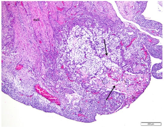 Regression of the post-ovulatory follicle occurs as orderly apoptosis in granulosa and thecal cells immediately after ovulation. Cords of connective tissue and fibroblasts (arrows) extend from the stalk (labeled) into the follicle as the basement membrane beneath the granulosa cell layer folds and creases into the follicular space. Vacuolar cells form as granulosa and thecal cells become filled with lipid inclusions. Infiltrates of heterophils (H) and lymphocytes (L) are distributed within the regressing follicle. H & E. 100×.