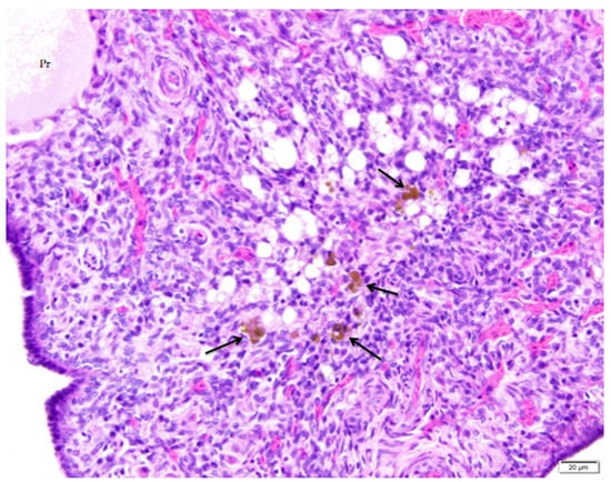 Like mammalian neutrophils, heterophils are first responders in acute inflammation events, particularly those associated with infectious agents [,,]. Although avian heterophils have a minor oxidative burst response, they can still cause tissue damage when they degranulate [,,]. There is no evidence that the heterophil infiltrates described in this study are causing tissue damage associated with acute inflammation or are the result of an infectious event. For example, we did not observe hyperemia, abnormal follicles, or tissue necrosis that is characteristic of oophoritis, a condition that is generally associated with a bacterial infection (e.g., []).