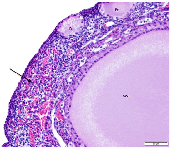 Infiltrates of heterophils (arrow) in the ovarian cortex are associated with atresia of small follicles. Primordial (Pr) follicles and a small white (SWF) follicle are labeled. H & E. 400×.