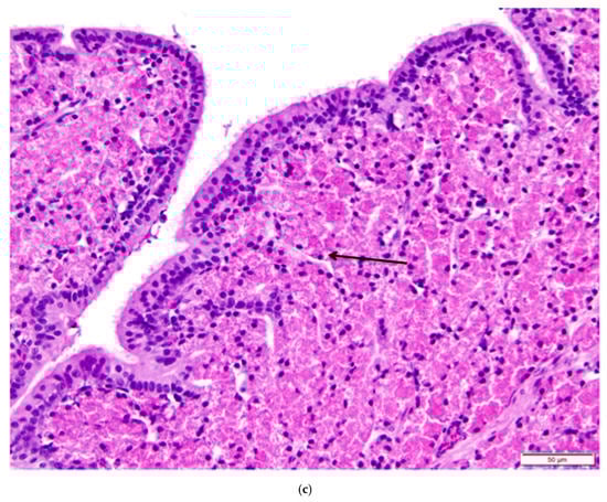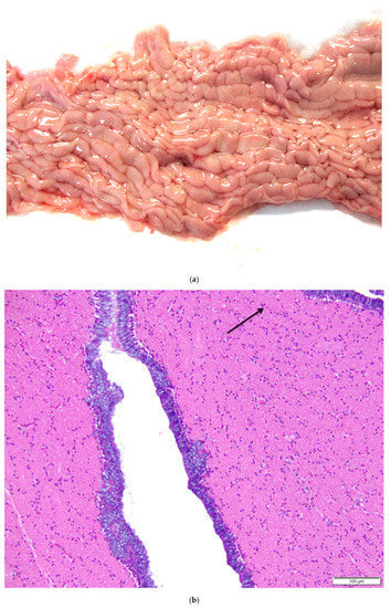 The magnum is the region in which albumen is secreted around the ovum. Both the muscularis and mucosal layers are significantly thicker than those in the infundibulum. The magnum is lined by anastomosing ridges and folds of mucosa (Figure 12a). Tubular glands in the mucosal layer are tightly packed into each fold. Cells lining the glands are densely packed with eosinophilic granules. As in the infundibulum, the folds have a thin core of submucosa. The surface epithelium is comprised of goblet cells and ciliated columnar cells. Goblet cells predominate during albumen secretion (Figure 12b) while the ciliated columnar cells predominate during a regenerative phase []. Different sections of the magnum can be in different phases. Lymphoid tissue is present in both mucosal and submucosal layers.