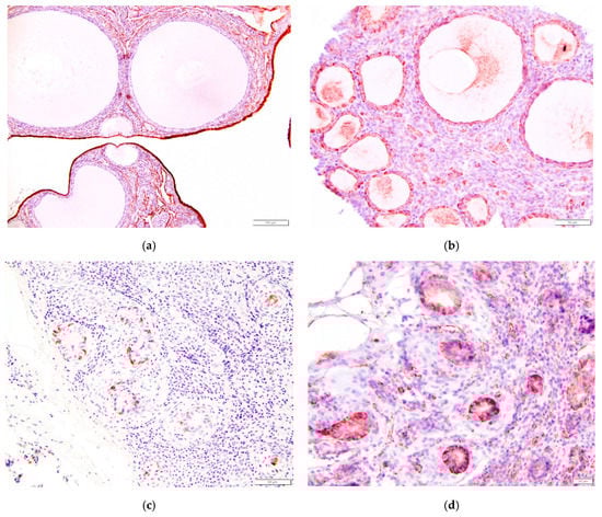 Immunohistochemical staining of rete ovarii has been described for several species, including fetal and adult cow, rat, pig, mouse, chicken, and human [,,,] (Table 1). The reaction of selected cells in the female reproductive tract to pancytokeratin, an epithelial marker, and vimentin, an intermediate filament protein expressed by cells with a mesenchymal phenotype, varies with species and is not always a reliable indicator of embryonic origin [].