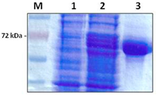 Purification of the E. coli recombinant multi-antigen by Ni-agarose chromatography gave a high purification yield. The purified protein was obtained as a clear band corresponding to the expected molecular weight of 72 kDa in a concentration of 1.2 mg/mL (Figure 1).