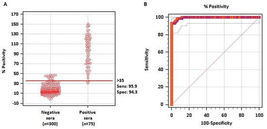 The frequency distribution plot of both negative and positive known sera is shown in Figure 2B. With the ROC analysis and establishing a priori a sensitivity of 95.9% and a specificity of 94.3%, a cutoff value of ≥35% was established. With these values only 2 false-negative and 18 false-positive test results were obtained out of the 375 samples analyzed.