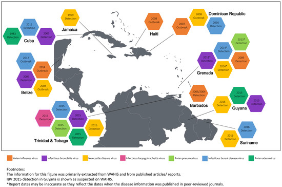 In this comprehensive review, studies reporting previous and current detections of eight high-priority viral pathogens of poultry within the Caribbean have been examined. For the sake of this review, all Caribbean island states have been included (Anguilla, Antigua and Barbuda, Aruba, Bahamas, Barbados, British Virgin Islands, Caribbean Netherlands, Cayman Islands, Cuba, Curaçao, Dominica, Dominican Republic, Grenada, Guadeloupe, Haiti, Jamaica, Martinique, Montserrat, Puerto Rico, Saint Barthélemy, St. Kitts and Nevis, St. Lucia, St. Martin/St. Maarten, St. Vincent and the Grenadines, T & T, Turks and Caicos Islands, Virgin Islands), as well as the Caribbean Community (CARICOM) mainland member states: Belize, Guyana, and Suriname. Selection of the eight viral pathogens for review was based on their global and regional importance and include avian influenza virus (AIV), infectious bronchitis virus (IBV), Newcastle disease virus (NDV), infectious laryngotracheitis virus (ILTV), avian metapneumovirus (aMPV), infectious bursal disease virus (IBDV), fowl adenovirus group 1 (FADV Gp1), and egg drop syndrome virus (EDSV).
