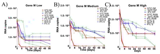 On day 0 (t = 0 days), M gene copies ranged from 2.4–2.8 × 102, 1.0–1.2 × 104 and 1.2–1.3 × 106 gene copies/µL, for low, medium and high RNA load, respectively, in all three storage matrices (Figure 1). The slight differences found between the estimated and the fixed concentrations (1.0 × 102, 1.0 × 104, 1.0 × 106 gene copies/µL for low, medium and high RNA load, respectively) could reflect differences in the methods used to obtain these concentrations. For the fixed RNA loads, the RNA transcripts were quantified by spectrophotometry, whereas, at t = 0 days, the RNA load estimated by was quantified using qRT-PCR, which is based on a fluorometric method. Nevertheless, it is important to highlight that although at t = 0 the RNA load estimated was slightly higher than expected, the magnitude order for the three conditions remained in the desired range.