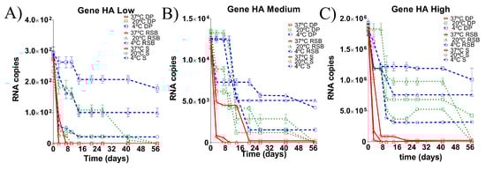 As for the M gene diagnostic target, the copy number of the HA gene (H5 subtype) was evaluated after RNA storage in different matrices and different temperatures. As for the M gene, at the beginning of the experiment (t = 0 days), the estimated RNA load was slightly higher than expected, ranging from 2.3–2.8 × 102, 1.2–1.3 × 104 and 1.7–1.9 × 106 gene copies/µL, for low, medium and high RNA load, respectively, for all the conditions (Figure 1). However, the order of magnitude for the three estimated RNA loads remained within the desired range. The target region of the HA gene at low RNA loads was detected by qRT-PCR in all matrices at 4 °C, but the RNA load detected in the dry pellet matrix was higher than the RNA loads detected in either the RSB and swab matrix (Figure 2A). At a temperature of 20 °C, the RNA isolated from the swab matrix was only barely detected until 7 dpi, while the RNA stored in either RSB or in dry pellet was detectable until 42 dpi. Importantly, the RNA concentration in dry pellet matrix was significantly higher than in RSB at this temperature (Figure 2A). At 37 °C, the target region was undetectable either in the RNA isolated from the swab matrix or the RNA stored in RSB. For RNA stored in the dry pellet matrix, the target region of the HA gene was detectable until at least 3 dpi (Figure 2A).