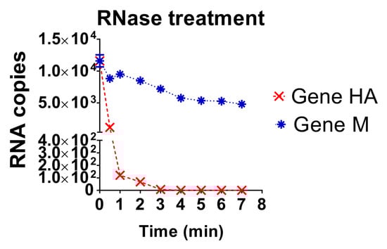 Comparison of the RNA load values under RNase A treatment for HA and M genes. The dynamics of degradation of RNA by the action of RNase A for each gene (HA gene and M gene) is shown. Data is mean of triplicate samples.