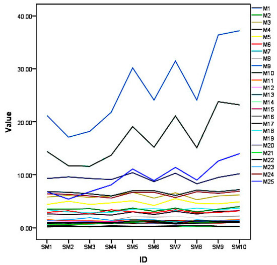 A diagram showing line graphs of each anatomical measurements of the 10 skulls and mandibles (SM) of the common opossum.