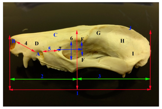 Photograph of the lateral view of the skull of the common opossum showing the skull measures. A infraorbital foramen; B a notch between the nasal and incisive bones; C nasal bone; D incisive bone; E zygomatic process of frontal bone; F frontal process of zygomatic bone; G frontal bone H Parietal bone; I temporal bone; J external sagittal crest; 1 skull length; 2 nasal length; 3 cranial length; 4 distance between the notch between the infraorbital foramen as well as nasal and incisive bones; 5 distance between infraorbital foramen and medial canthus of the eye; 6 orbital length; and, 7 orbital width.