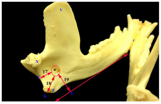Photograph of caudal view of the mandible of the common opossum showing the mandibular foramen and its anatomical landmark parameters. V coronoid process; X condylar process; Z angular process; U base of the mandible; Y caudal border of the mandibular foramen; a mandibular foramen; b mandibular angle; and, c mandibular symphysis.