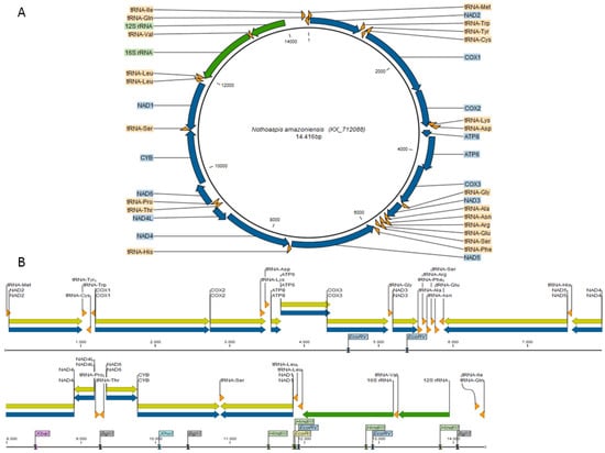 Mitochondrial genome map of Nothoaspis amazoniensis. (A) Circular representation; (B) linear representation. Thirty-seven genes (blue) and their respective CDS (yellow), two rRNA genes (green), and 22 tRNA genes (orange) are highlighted. The restriction enzyme sites are highlighted in the linear representation. The control region is located between the 12S rRNA and tRNA-IIe genes.
