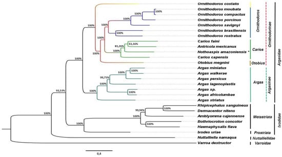 Within the Argasidae clade, Argasinae and Ornithodorinae subfamilies were also clustered into distinct monophyletic clades (PP = 100%). Only mitochondrial genomes of species of the Argas genus were clustered in the Argasinae clade. On the other hand, the mitogenomes of species of the genus Antricola, Carios, Nothoaspis, Ornithodoros, and Otobius were clustered together in the Ornithodorinae clade.