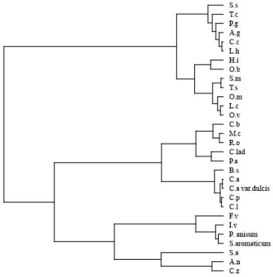 Statistical analysis was used to assess the high volume of information provided by the EOs’ composition. The classes of compounds in the EOs were subjected to multivariate analysis. Hierarchical cluster analysis HCA showed the presence of two main groups (Figure 1). The first group (A) includes the following oils: S. sclarea, T. capitatus, P. graveolens, A. graveolens, C. citratus, L. hybrida, H. italicum, O. basilicum, S. montana, T. vulgaris, O. majorana, L. cubeba, and O. vulgare. The second group (B) included all remaining oils, and it was further divided into two subgroups: B2 with EOs from C. zeylanicum, A. nobilis, S. album, S. aromaticum, P. anisum, I. verum, and F. vulgare, and B1 with the other EOs.