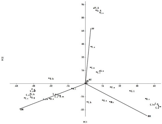 Principal compound analysis (PCA), where the first axis (PC1) explained for 45.4% and the second axis (PC2) for 33.0% (which resumed 78.4% of the total variability, Figure 2), evidenced that oxygenated monoterpenes (OMs) was the major class of compounds in all the EOs belonging to group A in HCA, and its percentages ranged from 40.6% in H. italicum EO to 89.2% in T. capitatus EO. The EOs that showed high amounts of phenylpropanoids were located in the upper-right quadrant of the PCA and referred to the plants present in subgroup B2 of the HCA, where P. anisum, I. verum, and S. aromaticum were characterized by the highest percentage of phenylpropanoids (up to 90%), while C. zeylanicum and A. nobilis oils evidenced relevant amounts of non-terpene derivatives (57.9% and 75.6% respectively). S. album EO that belonged to the same subgroup B2 was characterized by the highest percentage of oxygenated sesquiterpenes (88.8%). The presence of monoterpene hydrocarbons was predominant in the EOs of the plants inserted in subgroup B1, especially for all Citrus spp. (up to 90%), except for C. bergamia, which was characterized by an equivalent amount of monoterpene hydrocarbons and oxygenated monoterpenes.